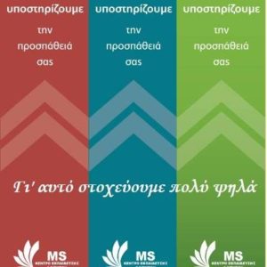 Γιατί το MS Κέντρο Εκπαίδευσης και Υποστήριξης Φοιτητών, το οποίο δημιουργήθηκε αρχικά ως ένα φροντιστήριο φοιτητών κι εξελίχθηκε με τις συνεχείς προσπάθειες κι επιτυχίες όλων των συνεργατών του, στηρίζει τις προσπάθειές σου, καθ’ όλη τη διάρκεια των σπουδών σου σε Προπτυχιακά και Μεταπτυχιακά Προγράμματα Σπουδών (Masters και PhD) σε όλα τα Πανεπιστημιακά καθώς και στα Τεχνολογικά Εκπαιδευτικά Ιδρύματα με όλες τις σύγχρονες μορφές εκπαίδευσης αλλά και την Εξ’ Αποστάσεως Εκπαίδευση στο Ελληνικό Ανοιχτό Πανεπιστήμιο (ΕΑΠ) και στο Ανοιχτό Πανεπιστήμιου της Κύπρου (ΑΠΚΥ) για την επιτυχή και ολοκληρωμένη φοίτησή σου.